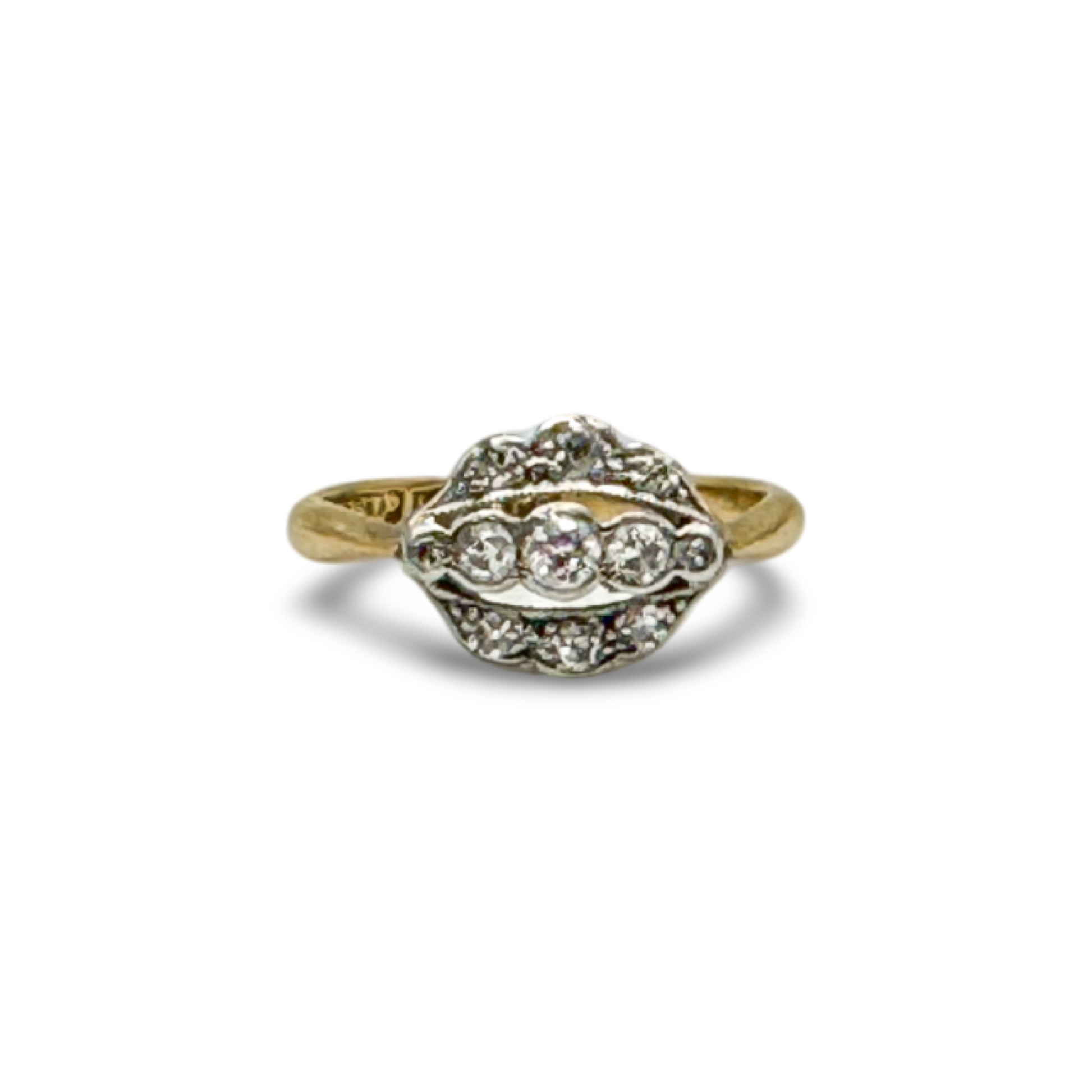 This beautiful Victorian era ring is crafted from 18k yellow gold with a scalloped filigree design and sparkling diamonds set in platinum. It is a size 4.75 but can be resized up or down by 2 sizes, making it the perfect option as an engagement ring or pinky ring.