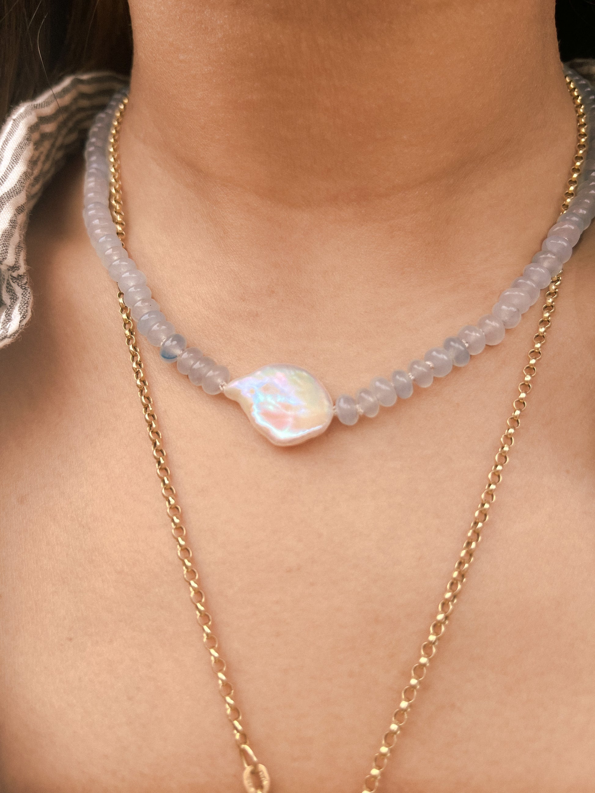 Part of our Agua Dulce Lite Collection, this necklace is comprised of a 14k yellow gold lobster clasp, 6x4mm blue jade rondel beads and one keshi pearl at the center knotted on silk thread. Handmade in Southern California. 15.75 inches long, other lengths available, email gold@bijouxroux.com