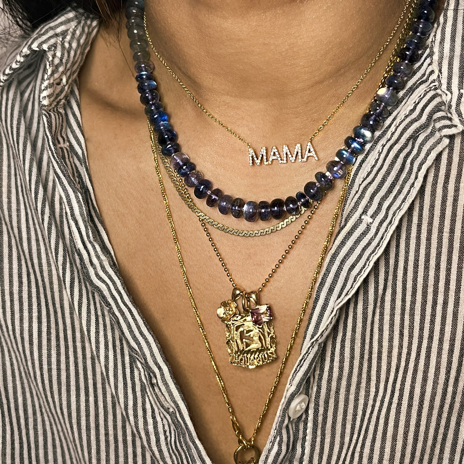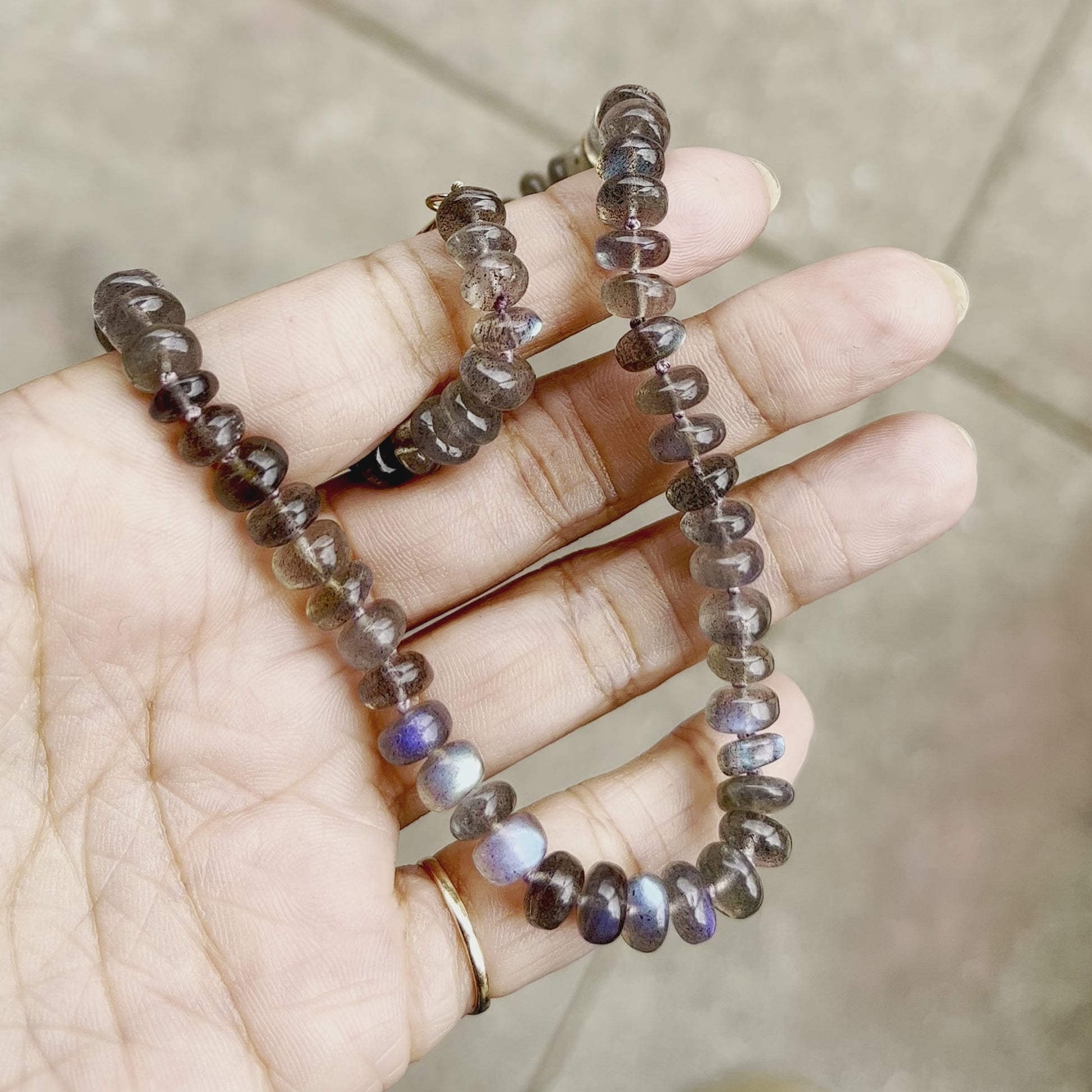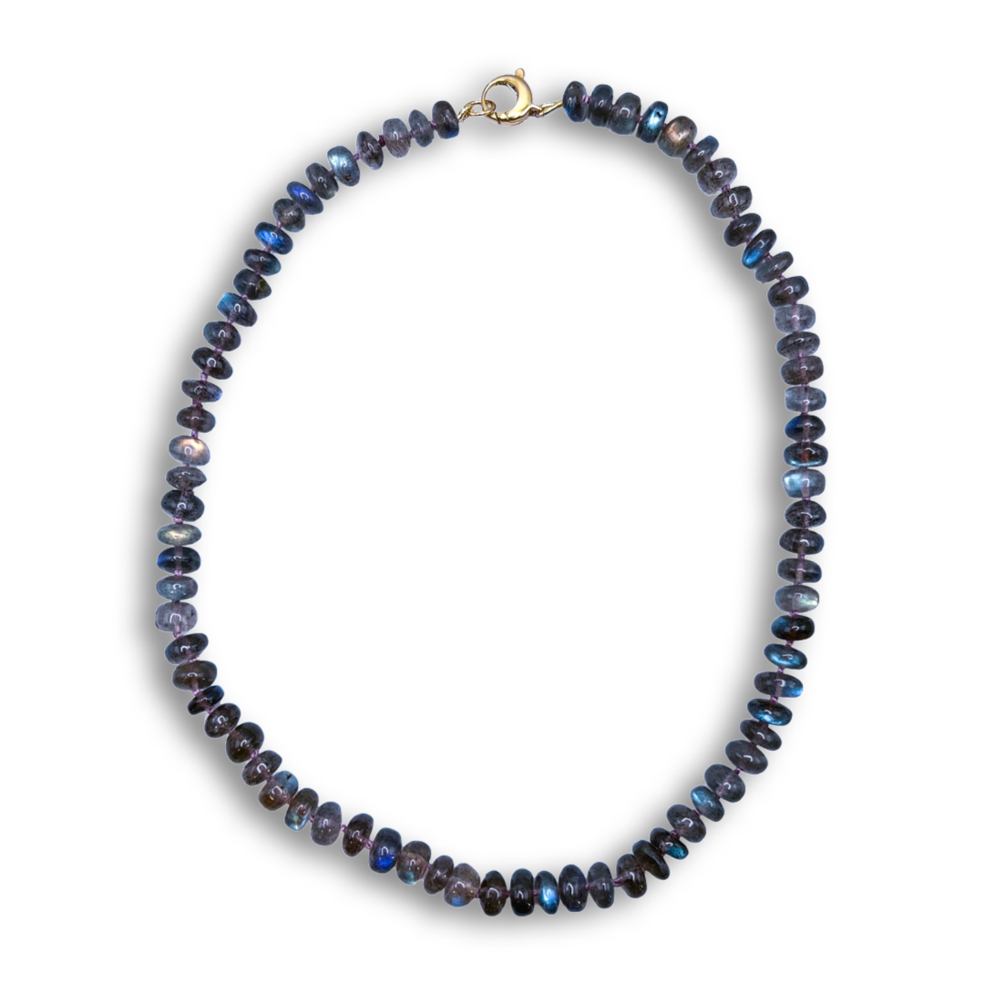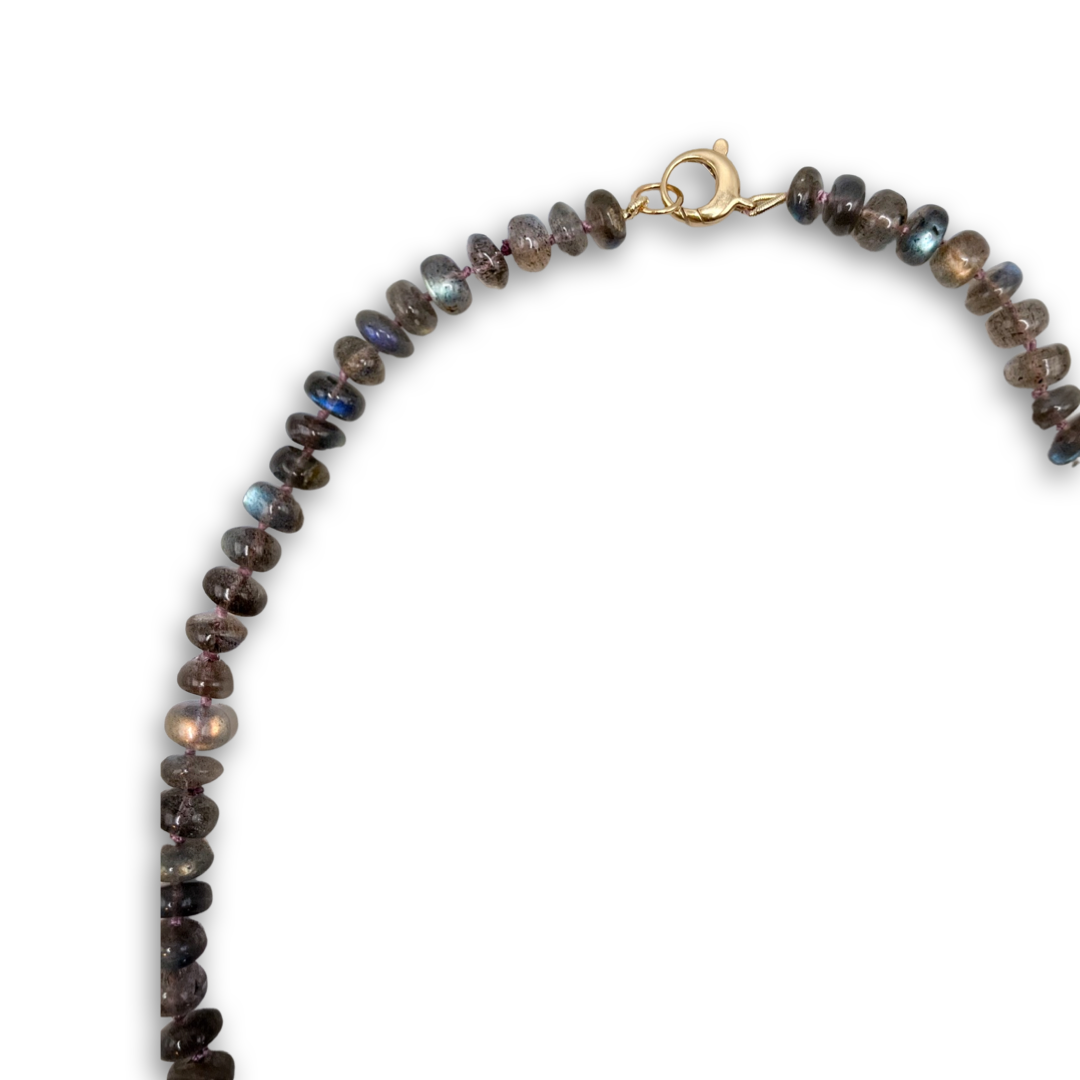Expertly crafted from 14k yellow gold and adorned with 7x4-5mm labradorite beads, this necklace is handmade in Southern California using luxurious silk thread. Measuring 15 inches in length, other sizes are also available upon request by emailing tracy@bijouxroux.com.