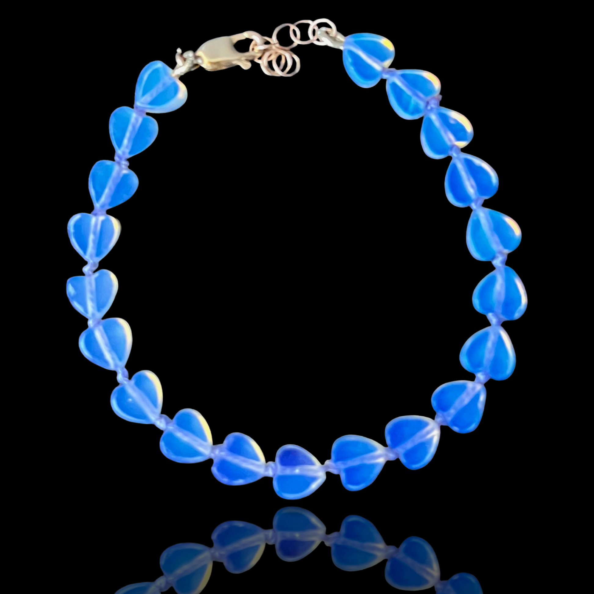 14k yellow gold with heart shaped opalite beads on silk thread. Handmade in Southern California. 6 - 7 inches long, other lengths available, email gold@bijouxroux.com