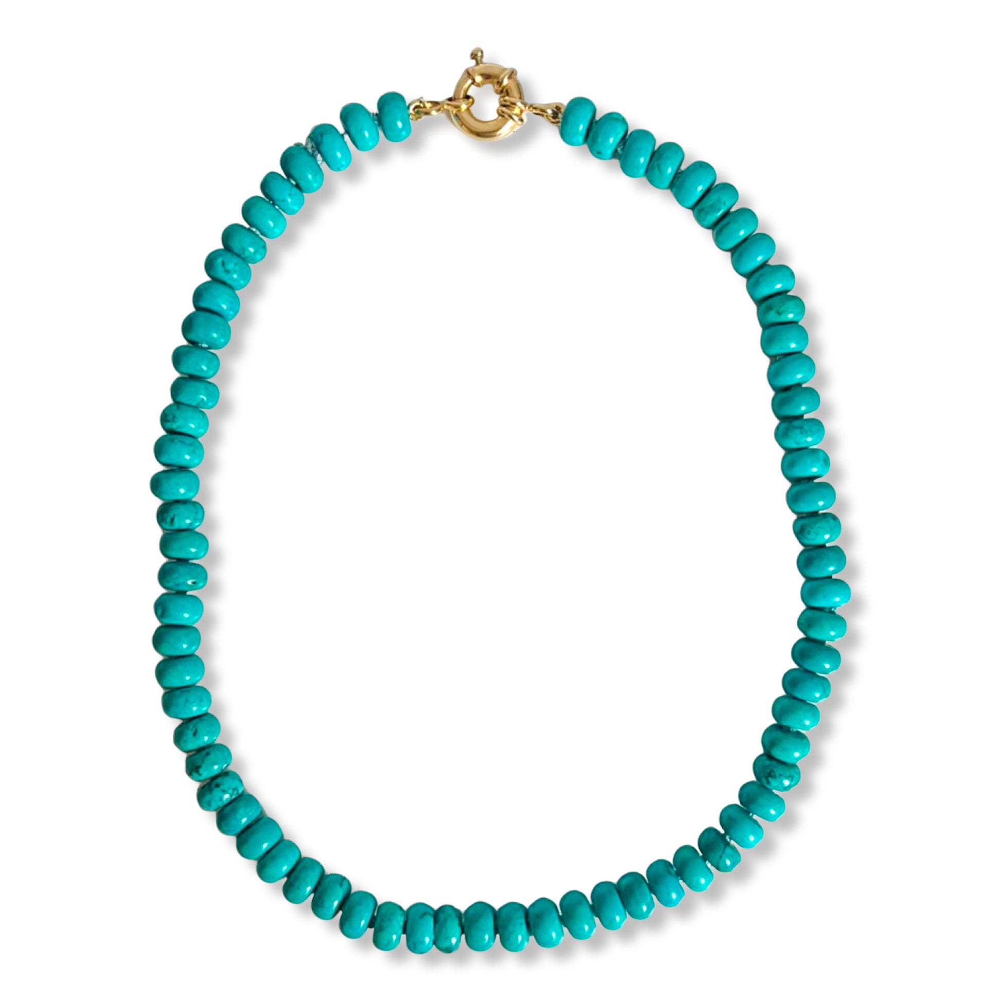 Crafted in Southern California, this necklace features 14k yellow gold with 8x5mm rondel turquoise beads neatly tied onto silk thread by hand. Enhance your wardrobe with this stylish and finely-crafted piece, perfect for any occasion.
