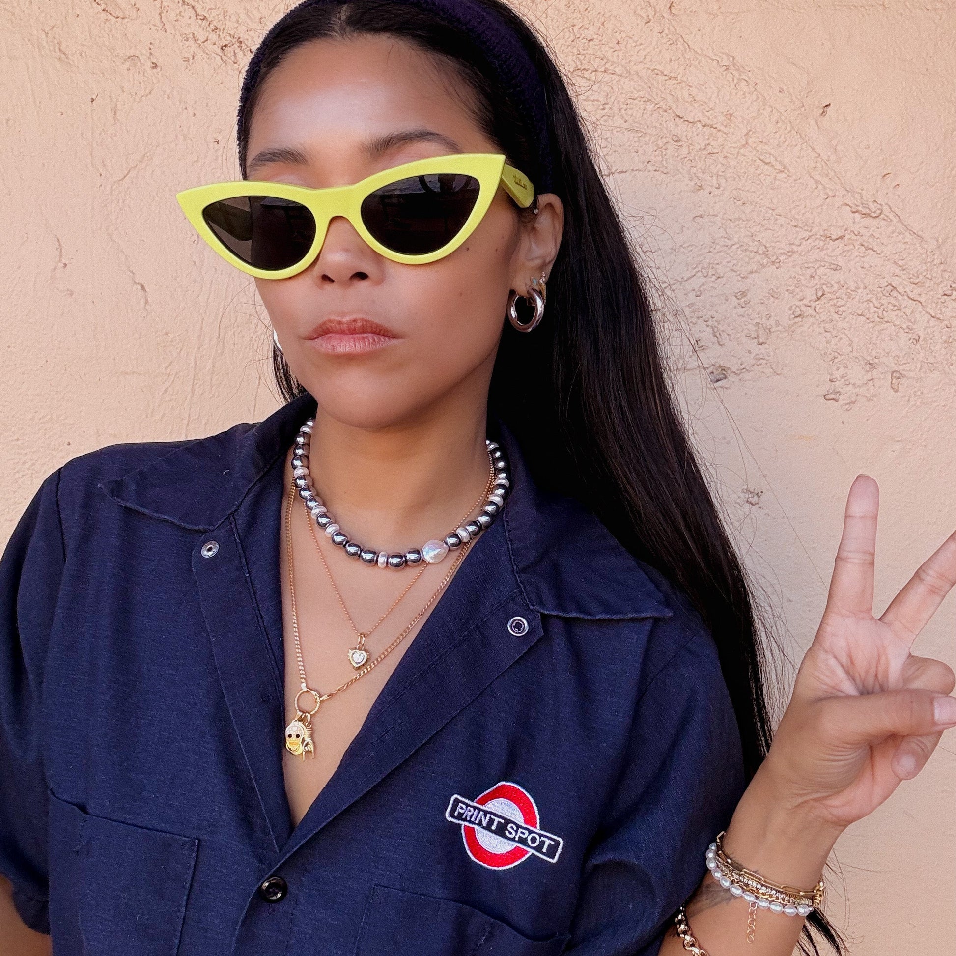 This piece is made of sterling silver with hematite, glass pearls & a Baroque pearl meticulously strung on nylon coated wire. Handmade in Southern California. Adjustable between 14.5 - 17 inches long