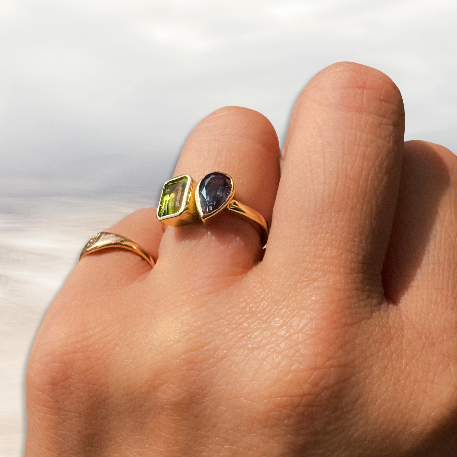 Crafted with a 14k gold bezel set design, this ring showcases an emerald cut peridot (August) and a pear shape Alexanderite (June), symbolizing the bond between a mother and her children.