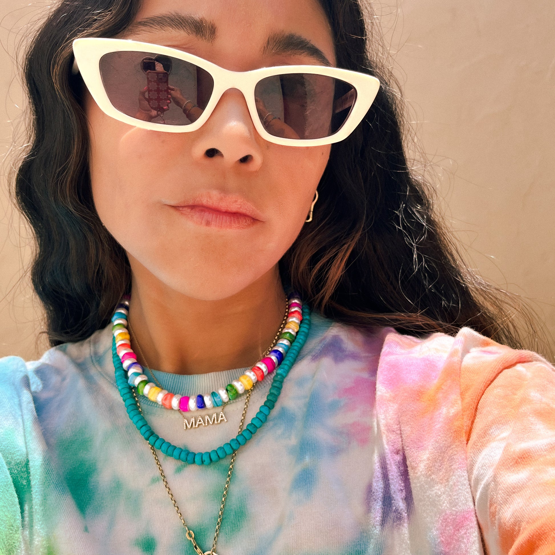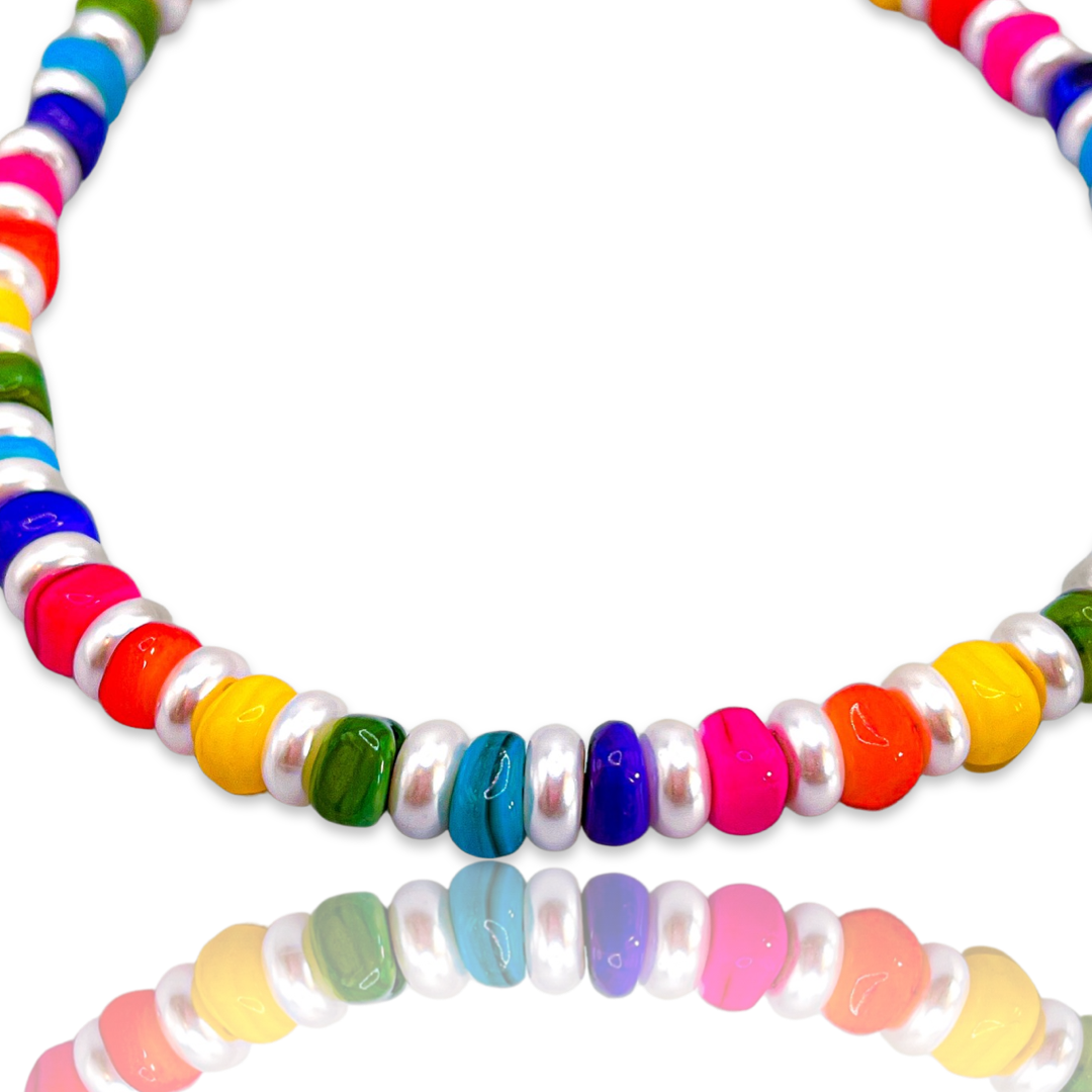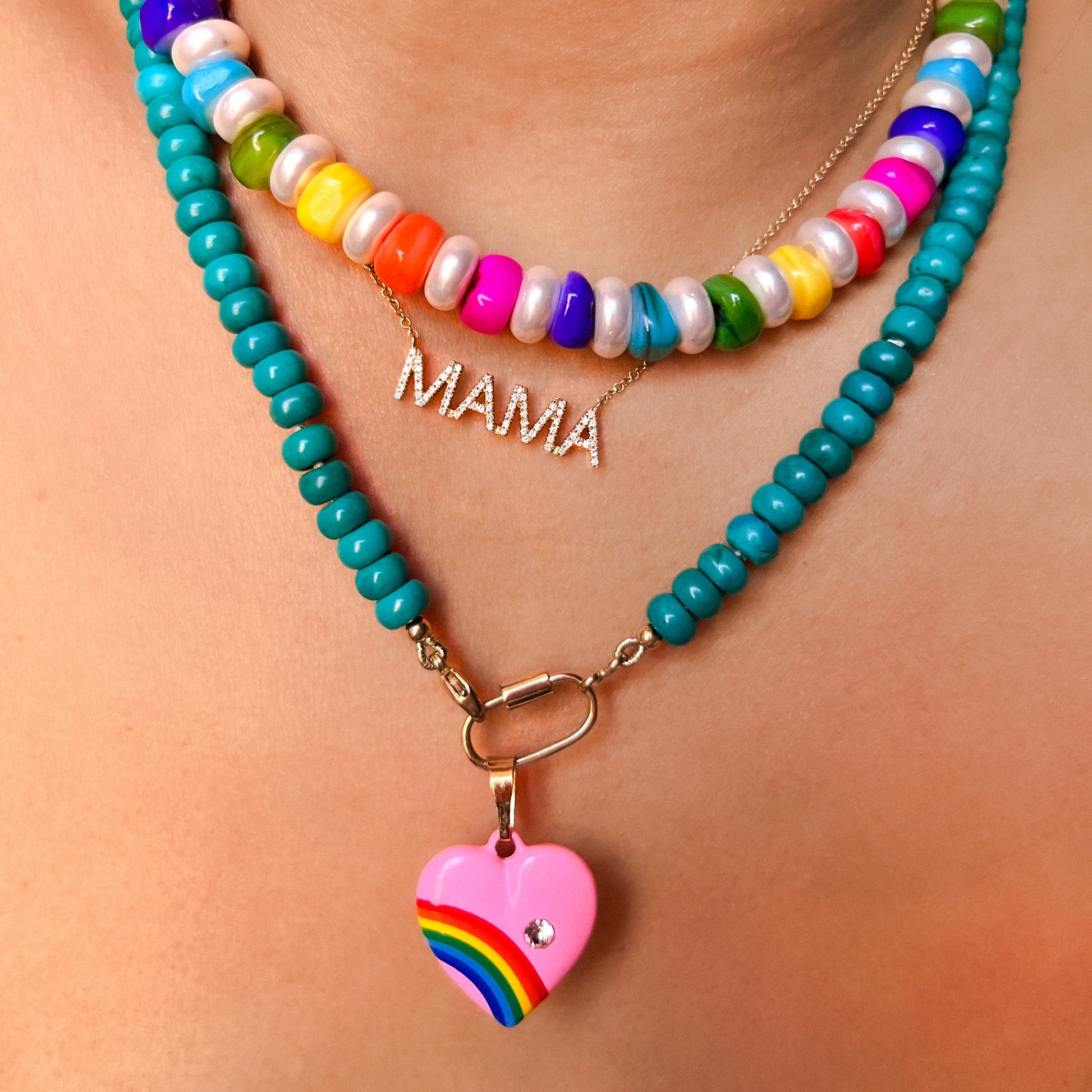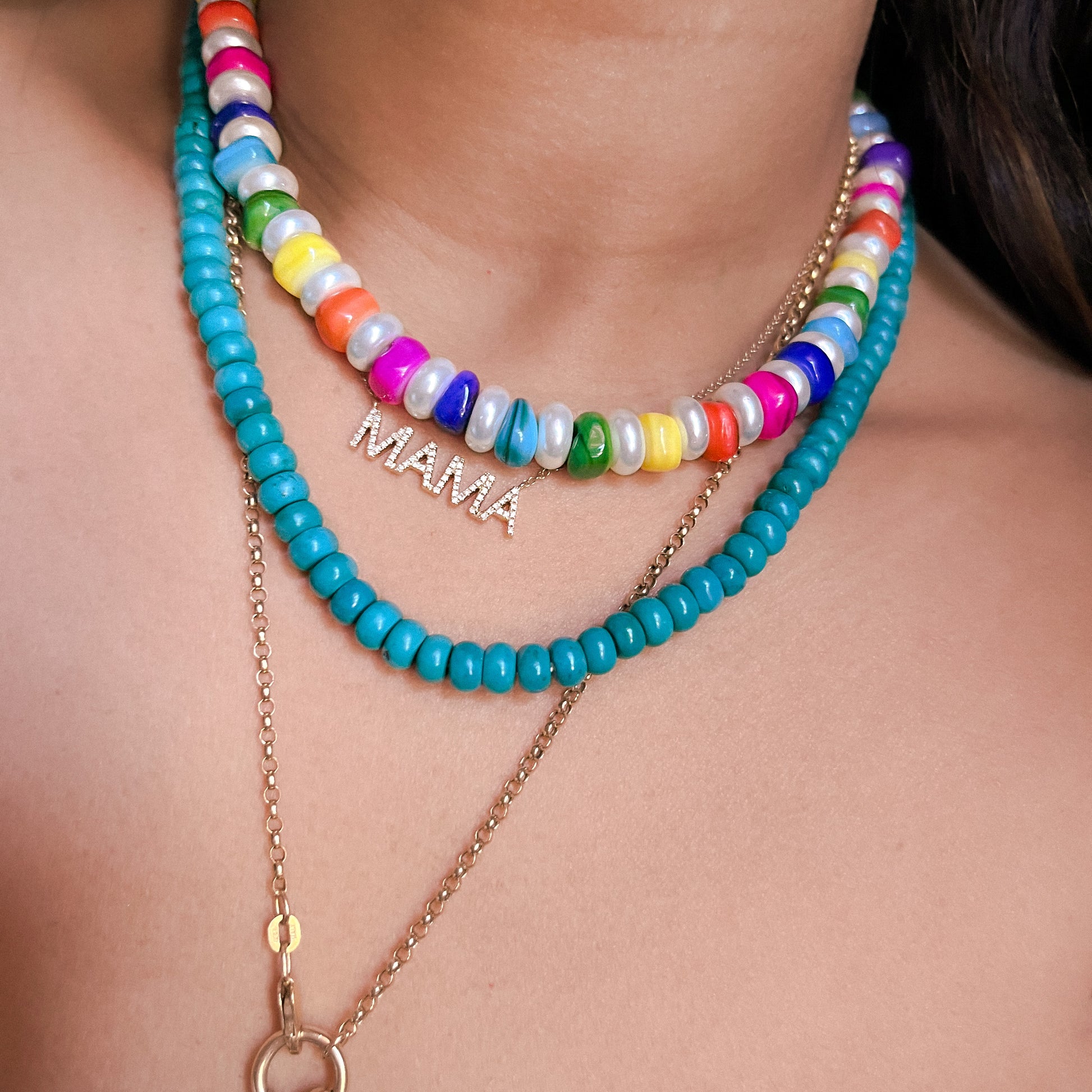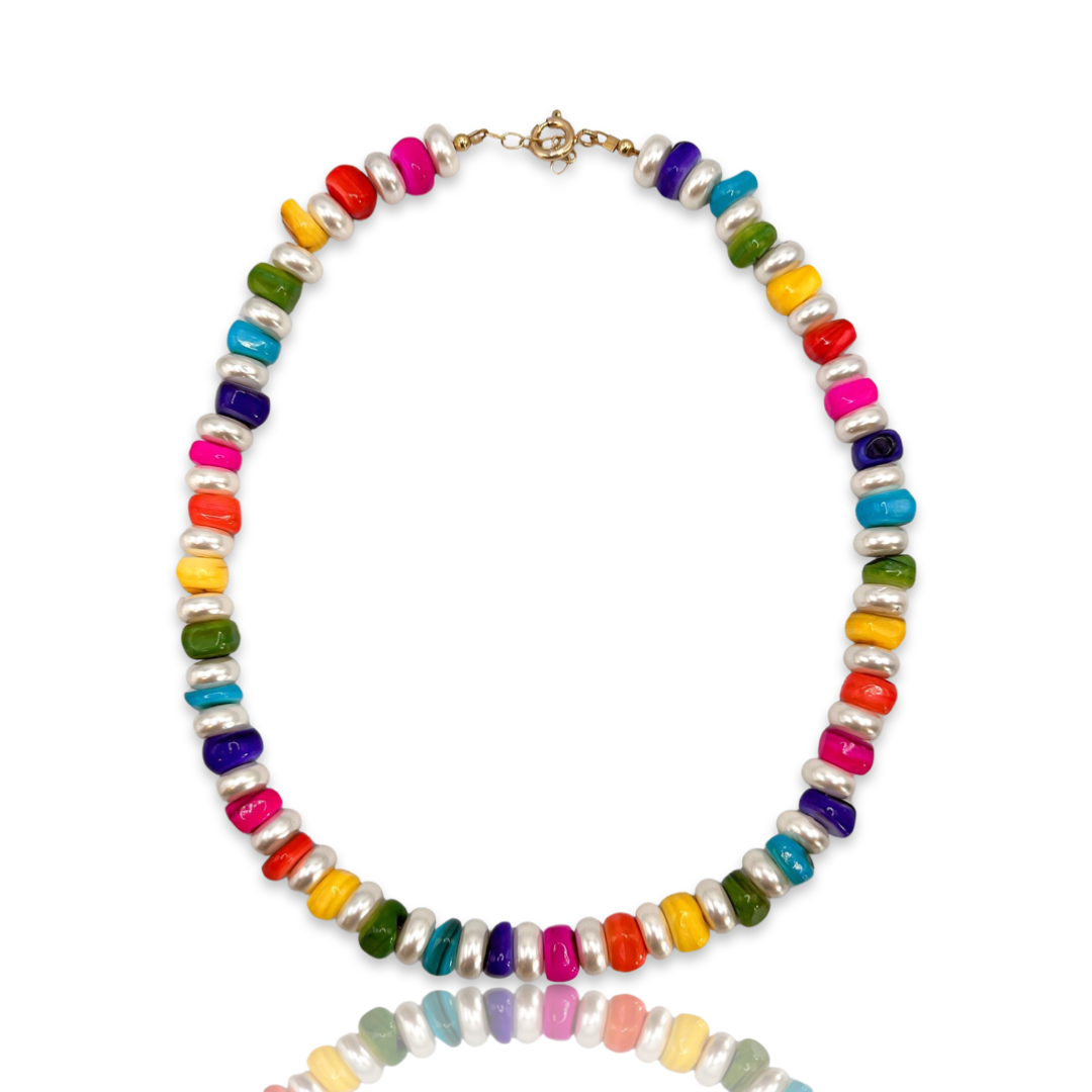 Part of our Amor L’amour collection this piece is made of 14k yellow gold with glass & dyed shell beads meticulously strung on nylon coat wire. Handmade in Southern California. 15 inches long, other lengths available, email tracy@bijouxroux.com