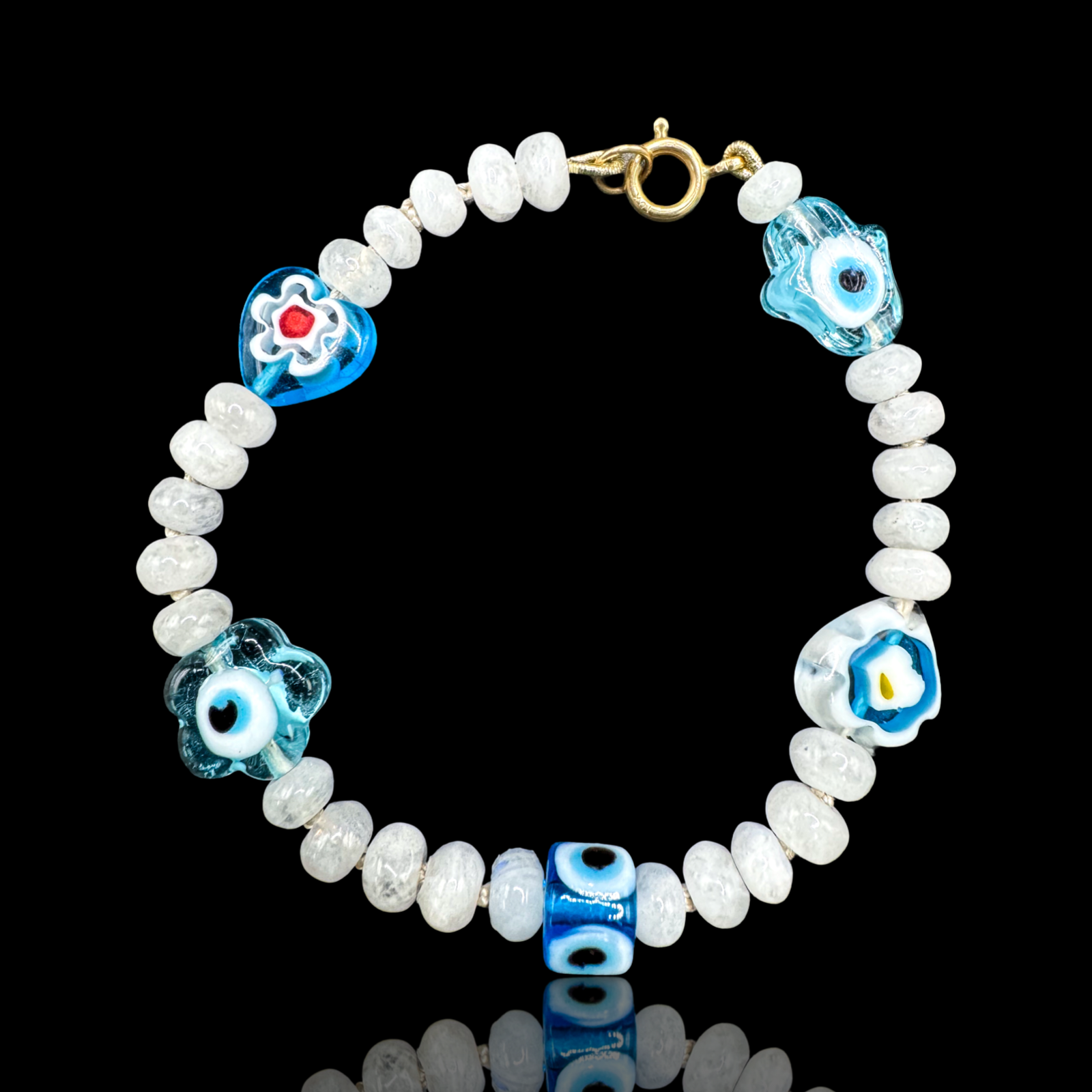 This artisanal bracelet features 14k yellow gold, white moonstone beads, and glass lamp work light blue eye beads. Inspired by the popular "Turkish Eyes" charm in Mexico, it is said to repel ill fortune and shield against negative influences targeted towards you. Handmade in Los Angeles, California, using knotted silk thread, this piece exudes elegance and offers potent protection.