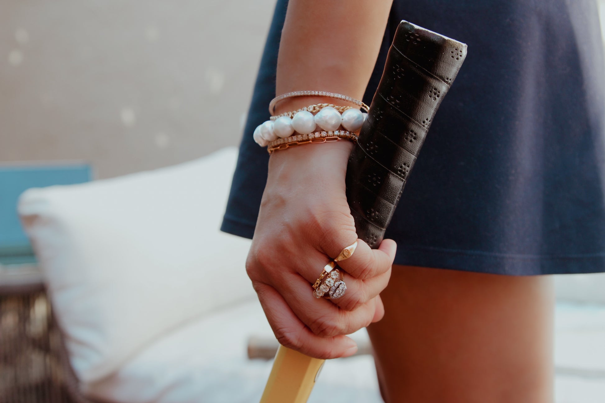 Expertly crafted in Southern California, this bracelet showcases a 14k yellow gold spring clasp and features exquisite white baroque pearls hand-strung on nylon coated wire. It comes in multiple lengths to accommodate different wrist sizes and effortlessly elevates any outfit. For more information, please contact Tracy@bijouxroux.com.