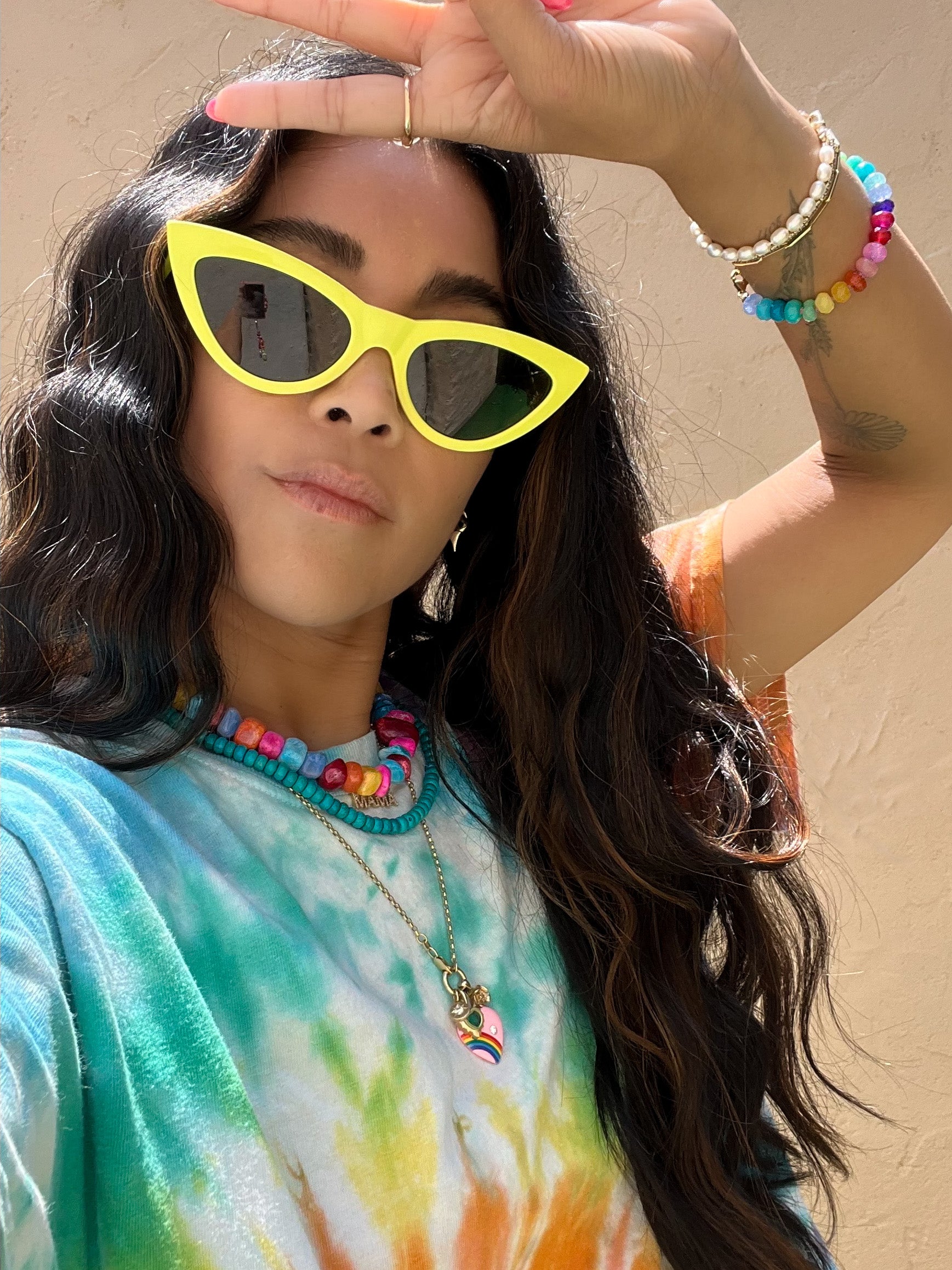 Part of our Amor L’amour collection, the necklace is made with 10-14k yellow gold with dyed jade nuggets & crystal beads strung on nylon coated wire. Handmade in Southern California. 15 inches long, other lengths available, email tracy@bijouxroux.com