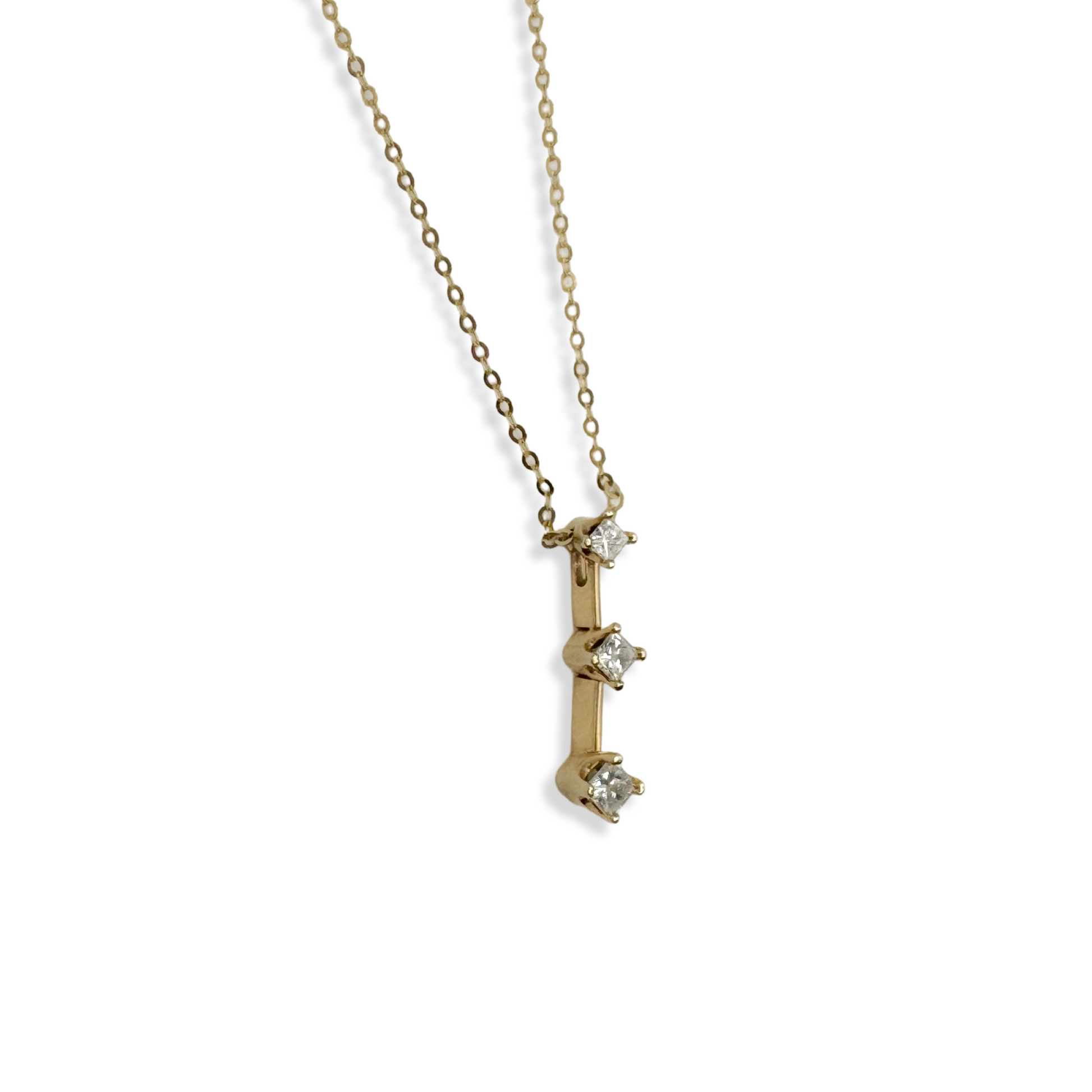 This Vintage Diamond Pendant Necklace is crafted from 14k yellow gold and three round diamonds on a new 16” 14k dainty cable chain. One of a kind