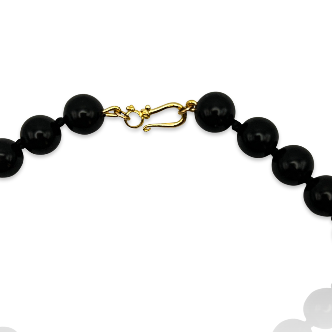 14k yellow gold with 10mm round agate beads knotted on silk thread. Handmade in Southern California. 15 inches long, other lengths available, email tracy@bijouxroux.com